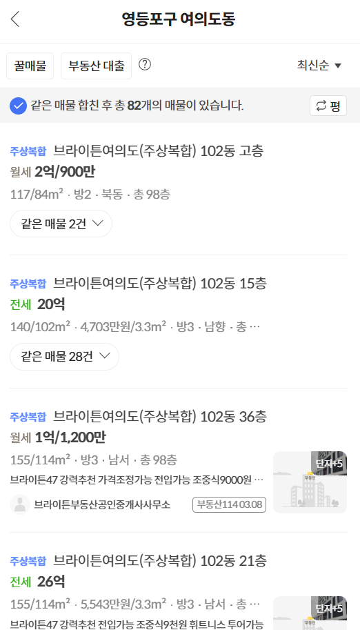 • 입력한 검색어와 관련된 부동산 목록이 표시됩니다.