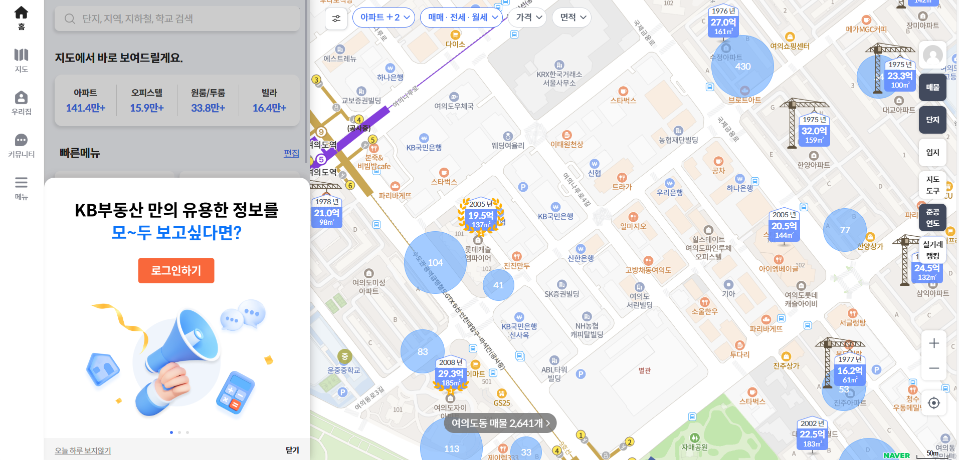 • 메인 화면에서 다양한 부동산 정보를 확인할 수 있습니다.