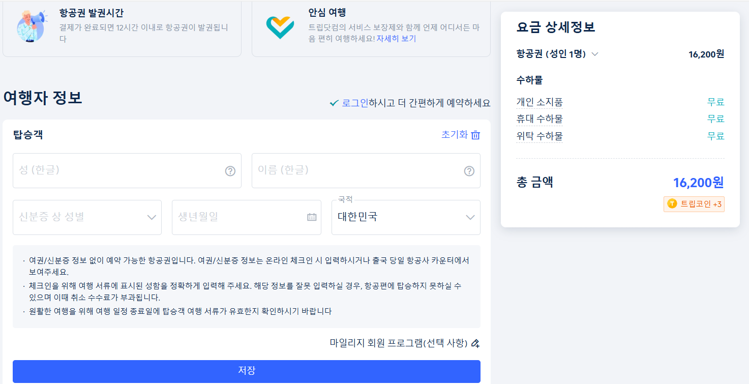 4. 여행자 정보를 입력한 후 결제를 한다.