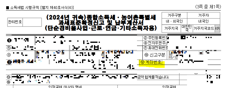 - 신고서 내의 ‘환급금 계좌신고’ 항목에서 등록된 계좌번호를 확인할 수 있습니다.