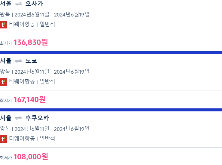 위 링크를 클릭한 후, '특가 항공권' 페이지에서 일본 최저가 항공권 조회하실 수 있습니다. 현재 시간 기준으로 조회해보니 오사카, 도쿄, 후쿠오카 항공권이 모두 10~16만원 내로 조회되네요. 더 저렴한 항공권 찾으실 수도 있으니 직접 조회해보시기 바랍니다.