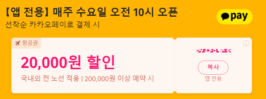 매주 수요일 오전 1시에 선착순으로 오픈합니다. 카카오페이로 결제 시에 적용돼요. 국내선/국제선 모두 적용되며 20만원 이상 예약 시 적용하실 수 있어요.