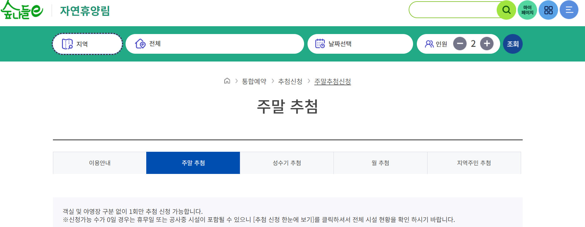 매월 4일~9일에 숲나들e에 접속하면 주말 추첨제를 신청할 수 있는 창이 뜹니다.
