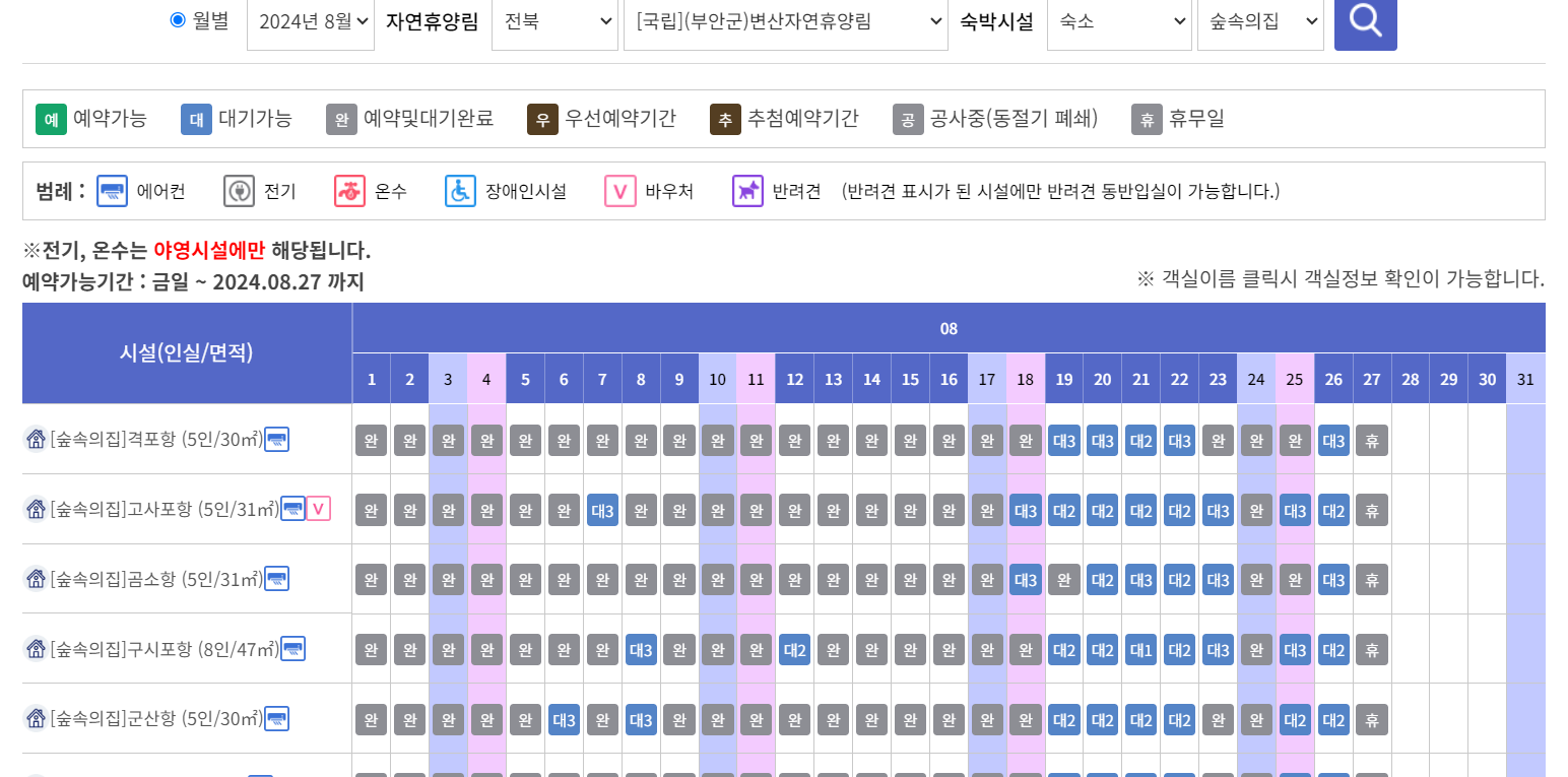 숙박 가격은 휴양림마다 다른데 가장 인기있는 국립변산자연휴양림의 경우, 기준인원 5명에 102,000원이었어요. 정말 저렴한 편이죠~