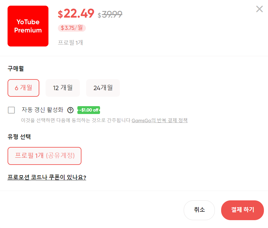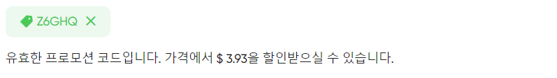 구매 시 구독할 기간과 자동 갱신 여부를 선택할 수 있습니다. 또한, 할인코드를 적용할 수 있는 옵션도 있는데, 할인코드 'Z6GHQ'를 입력하면 5% 추가 할인이 적용됩니다.
