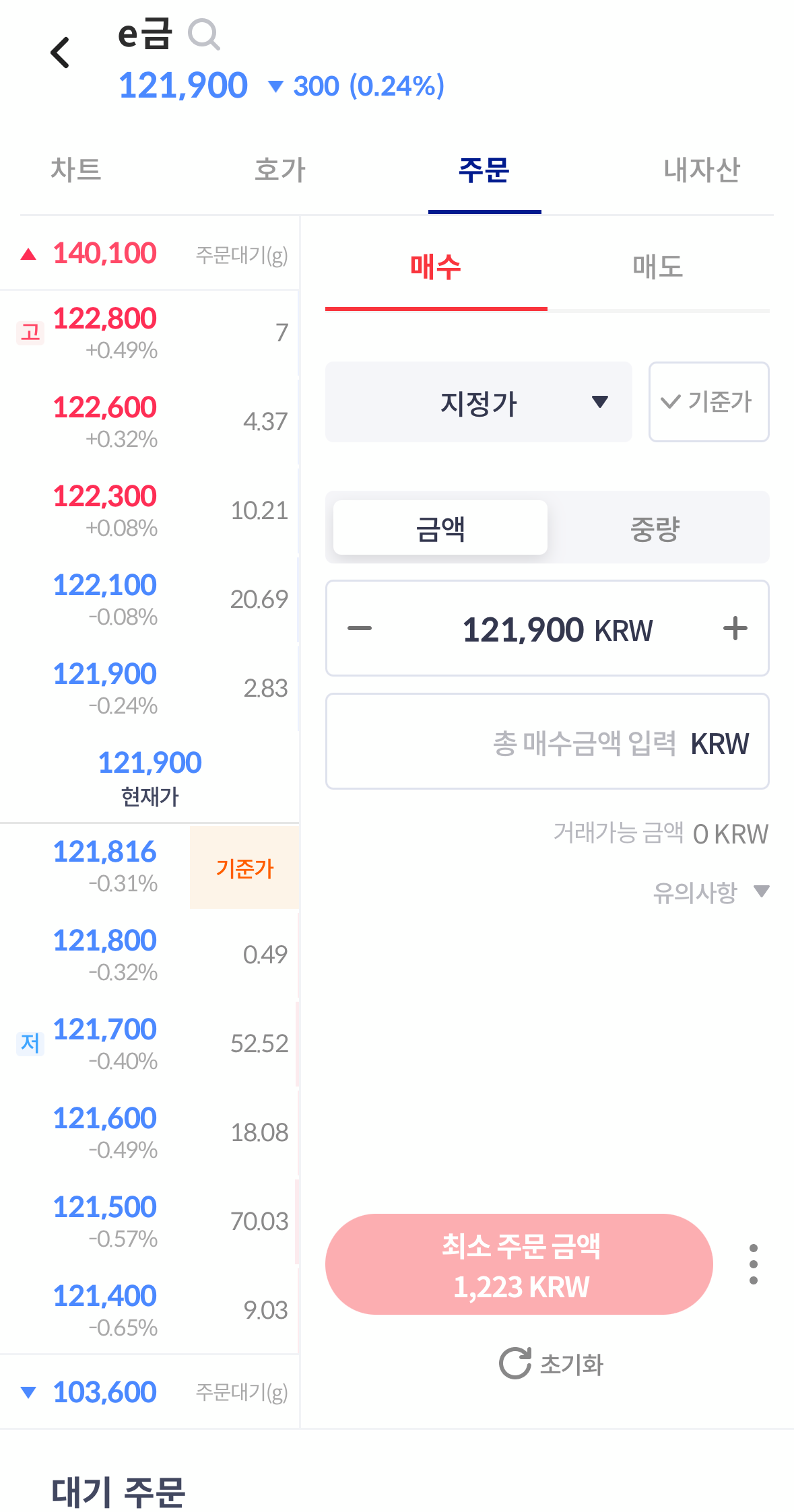 매수 완료 후, '내 자산' 또는 '거래 내역' 메뉴에서 보유한 e금의 수량과 거래 내역을 확인할 수 있습니다.