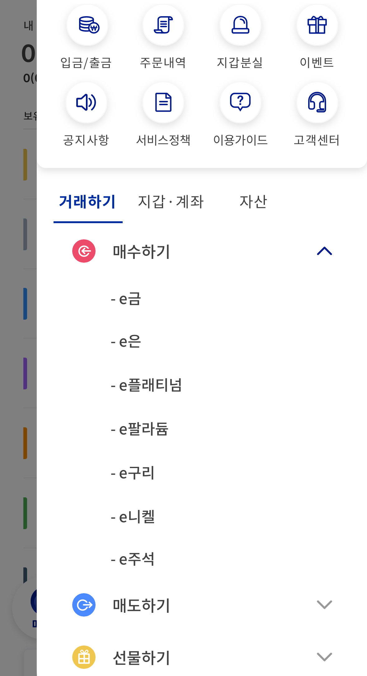 매수 완료 후, '내 자산' 또는 '거래 내역' 메뉴에서 보유한 e금의 수량과 거래 내역을 확인할 수 있습니다.